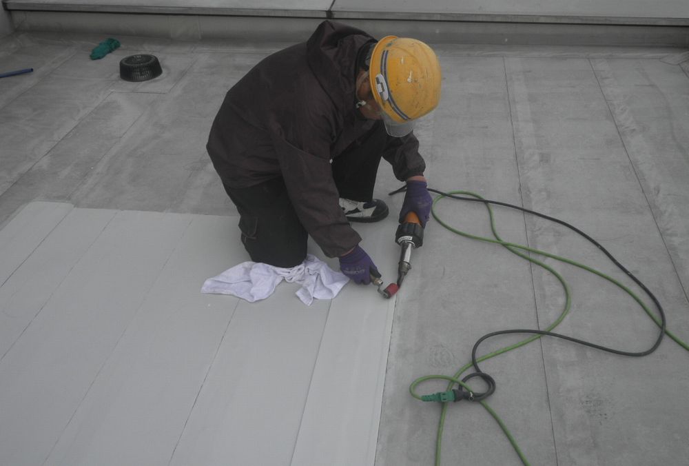 鉄板付きシート材料を熱で貼り付ける工法にて防水工事を行っています。